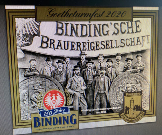 Der diesjährige Goetheturmfest-Bierkrug ehrt gleichzeitig das 150jährige Bestehen der Binding-Brauerei. Das Motiv zeigt die Binding’sche Brauereigemeinschaft von 1895.